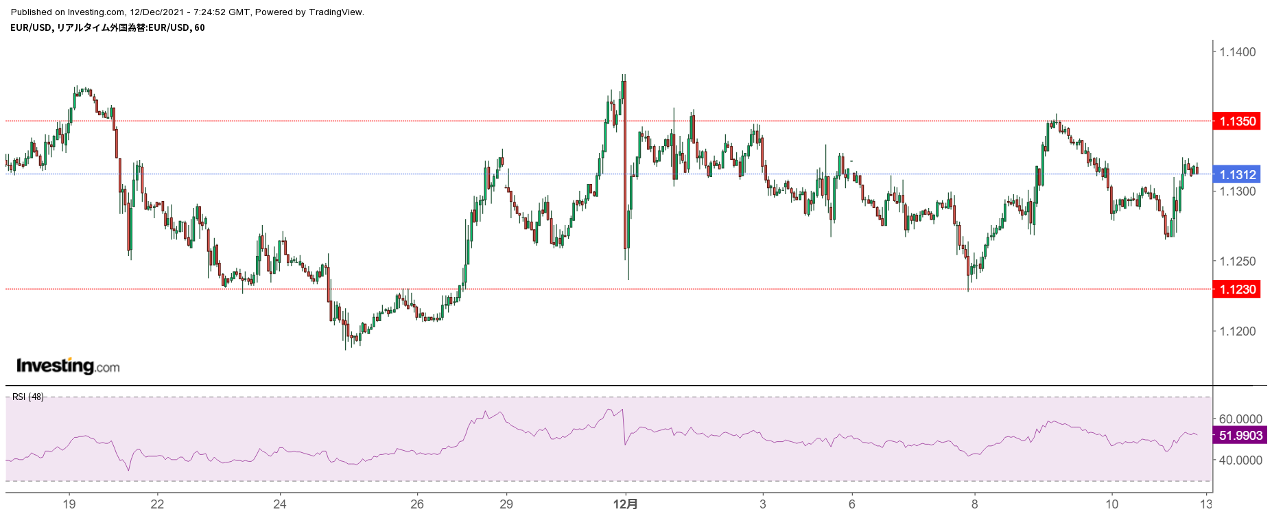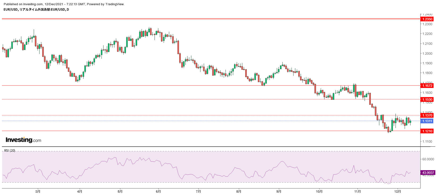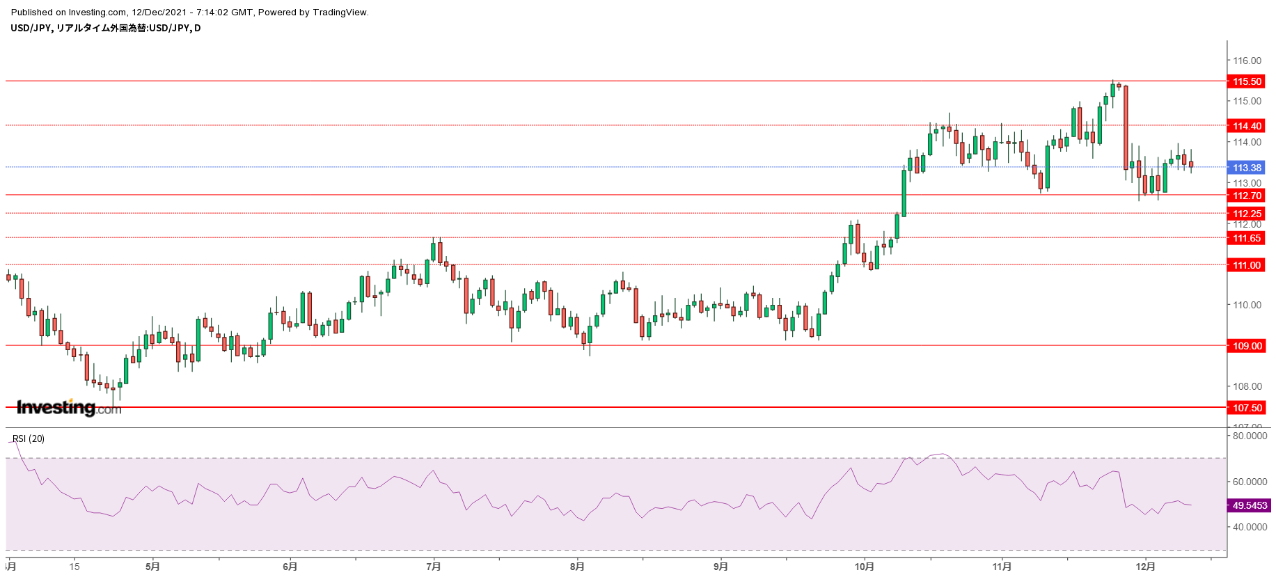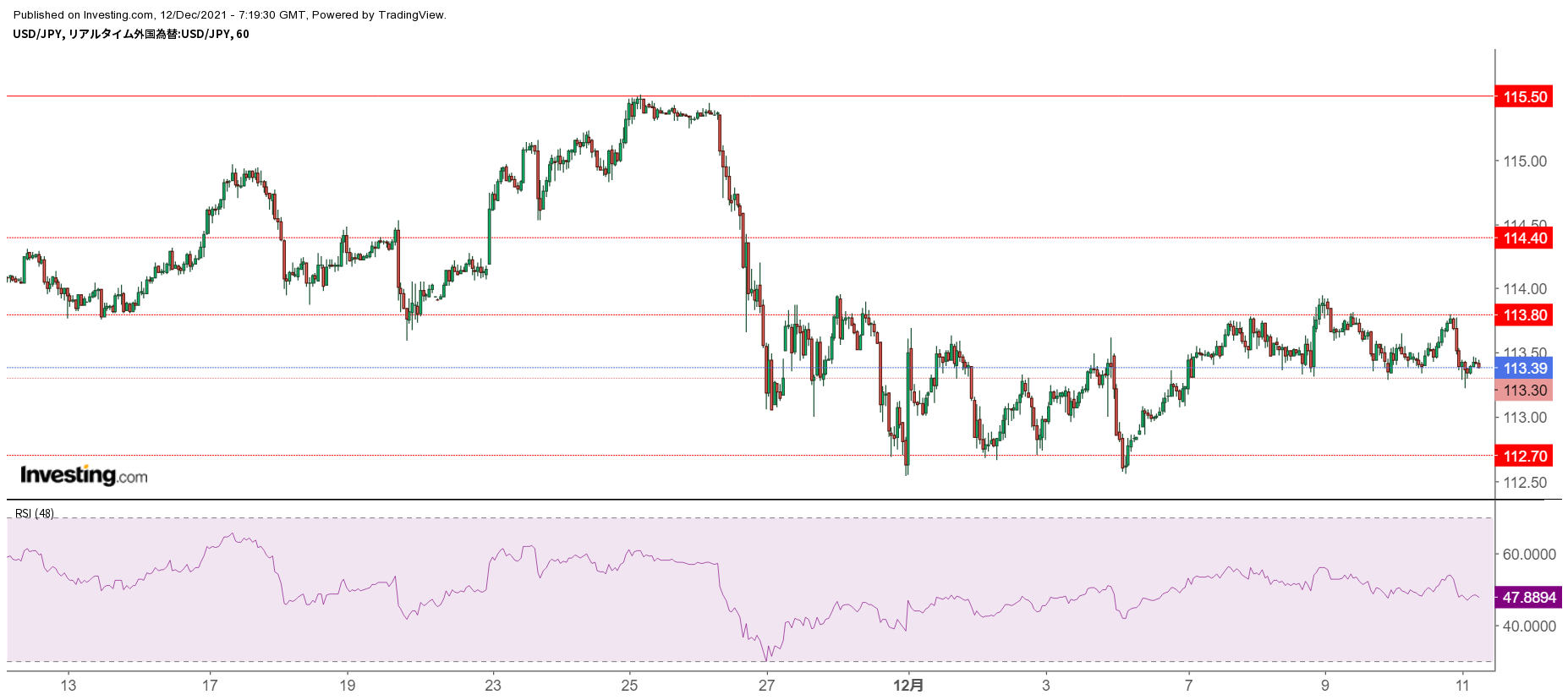 - 先週のドル円相場は、1ドル=112.78円からスタート。先週末の流れを引き継ぎドル買戻し優勢で始まると、アジア時間に113円を、NY時間には意識された113.30円を突破。その後もオミクロン株への不安が和らぎ米株が買い戻される中でドル円の上昇基調は続き、8日(水曜日)のNY時間には113.96円まで上昇した。9日、10日は米株に調整が入る中で、クロス円は売られ、ドル円も利食い優勢。一時113.22円まで下落した後、わずかに買い戻され113.38円でクローズ。