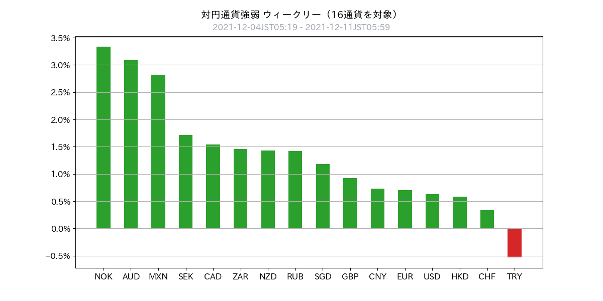 - 先週の通貨強弱は右記の通り ノルウェーなど産油国 > 人民元 > ユーロ > 米ドル > 日本円 > トルコリラ