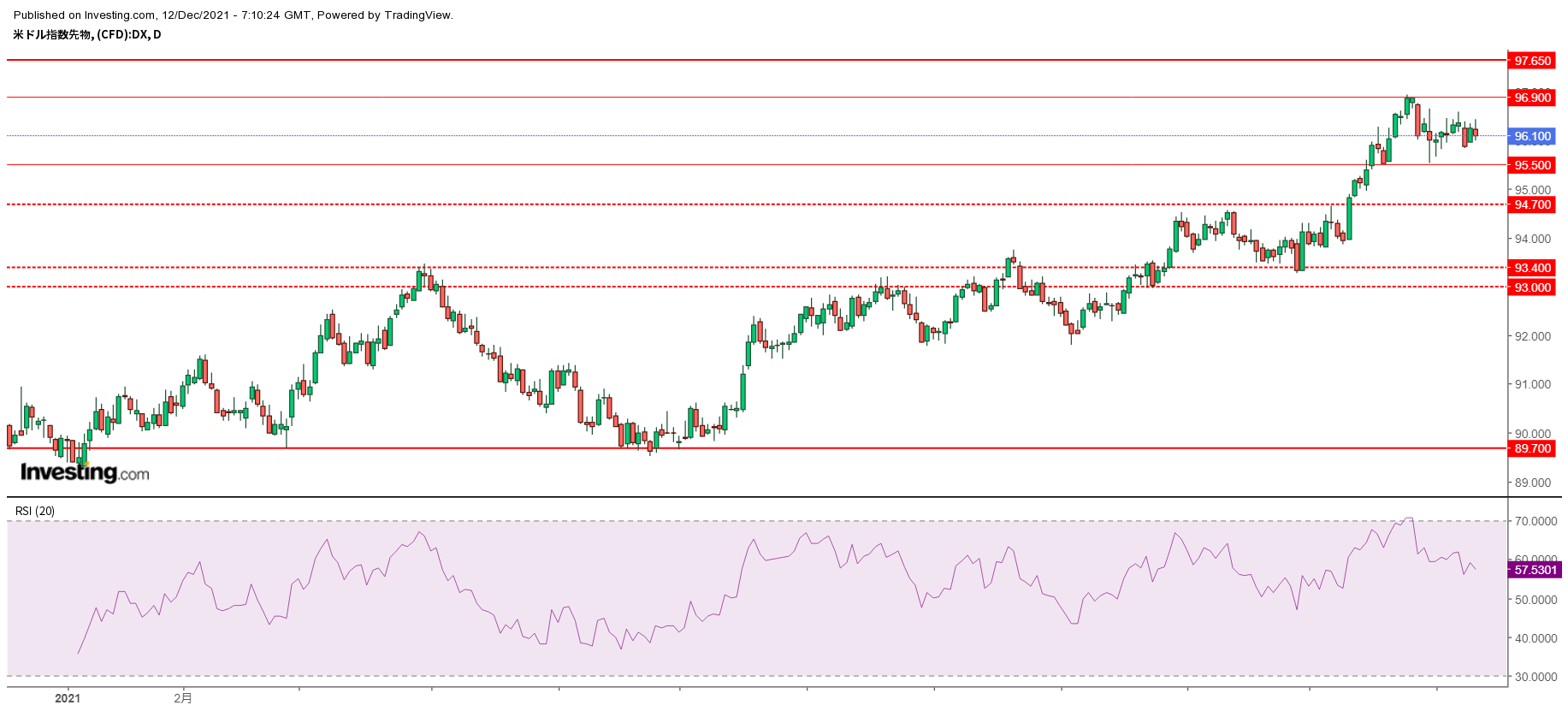 - ドル高基調の中で95.50~96.90レンジで推移している