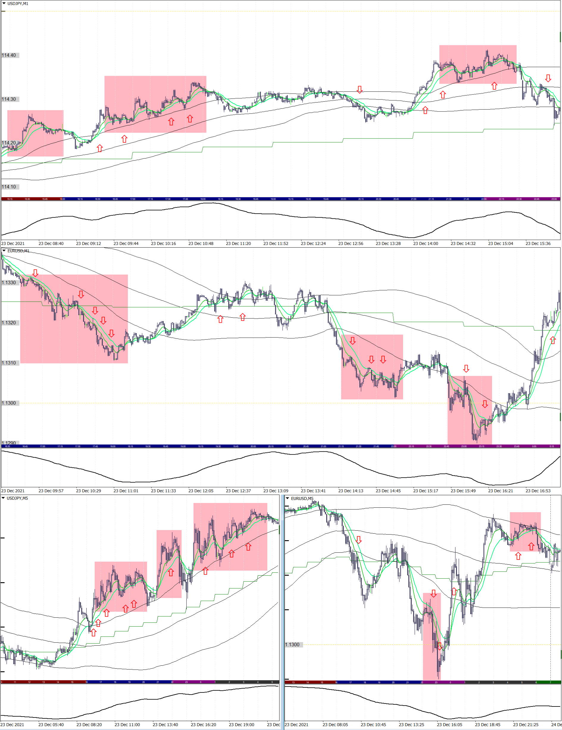 赤矢印:1日+3~10pipsのスキャルロジックによる、エントリーポイント