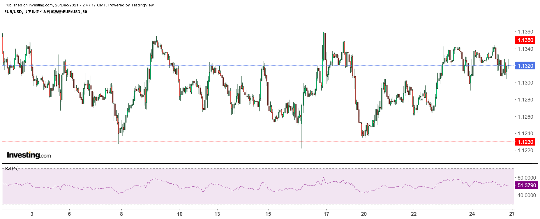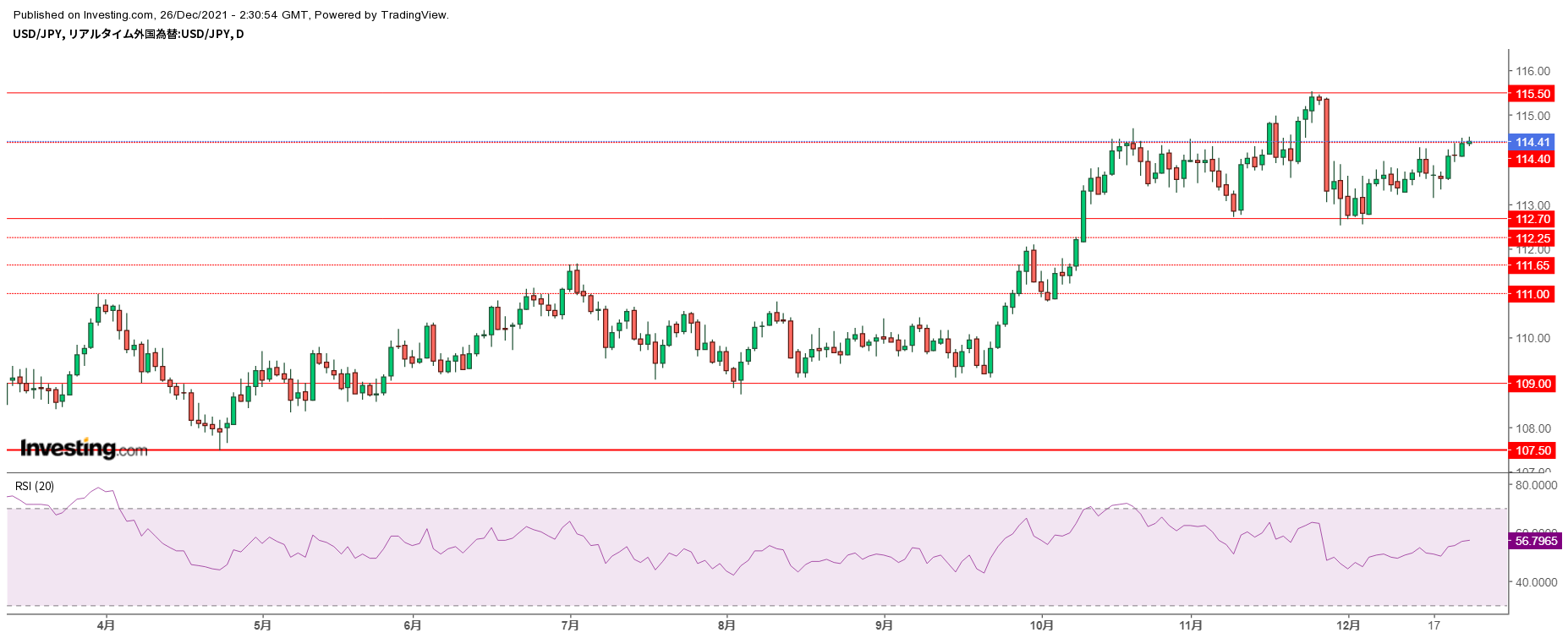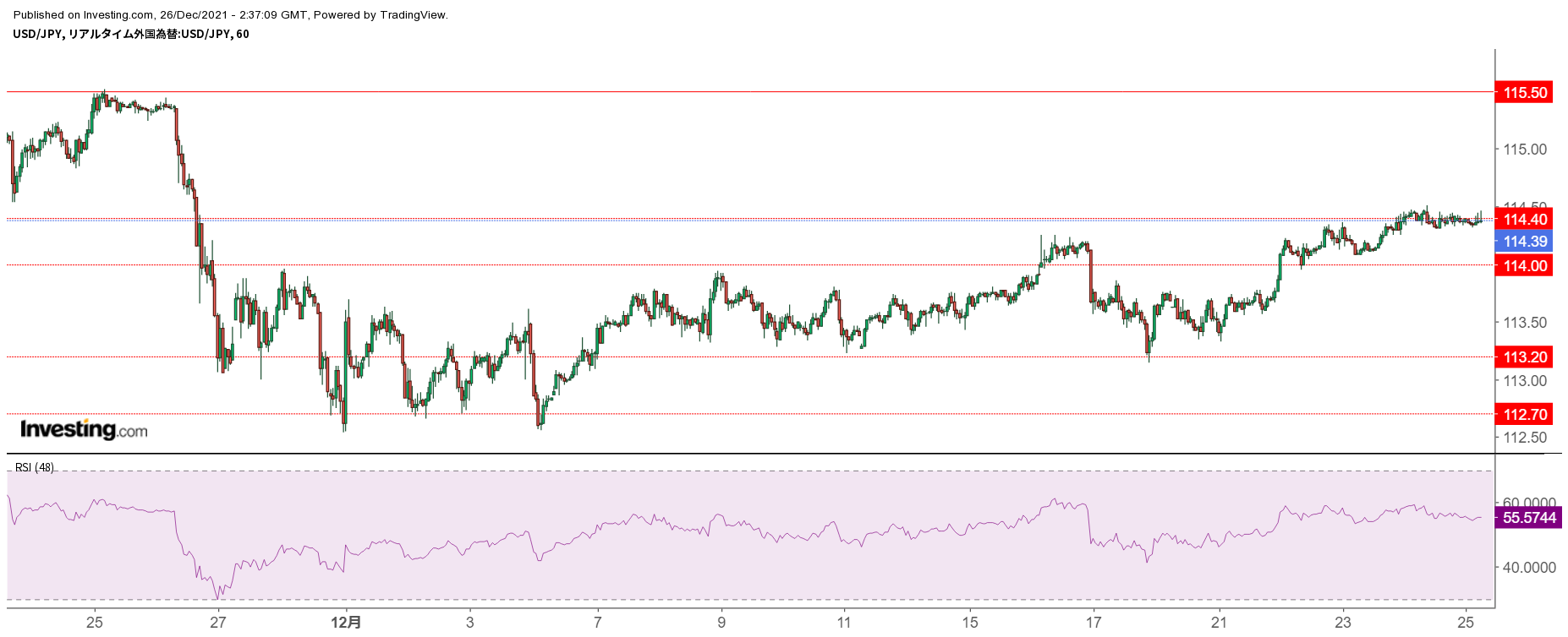 - 先週のドル円相場は、1ドル=113.63円からスタート。週初こそ下値を試す展開となり113.33円まで緩やかに下落したが、その後はトルコリラの反発上昇によるセンチメントの改善や、製薬各社からのオミクロン株に対するワクチンの有効性が示されると、マーケットは徐々にリスクオン地合いとなり、ドル円もじり高の展開が続いた。24日金曜日に114.52円の今週高値をつけると、その後はクリスマス休暇で小動きとなり同水準の114.41でクローズ。