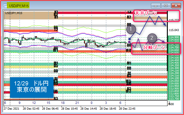 東京は、”分岐ゾーン”114.60=75を底値に、”天井ゾーン”115.25=40のどこまで上昇できるかがキーポイントです。