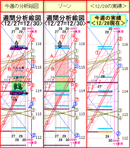 理想は、今週の上昇時ターゲットrとした115円台が実現ですが、年末前日にどこまで相場が動くのか次第となり、以下の3パターンを想定。