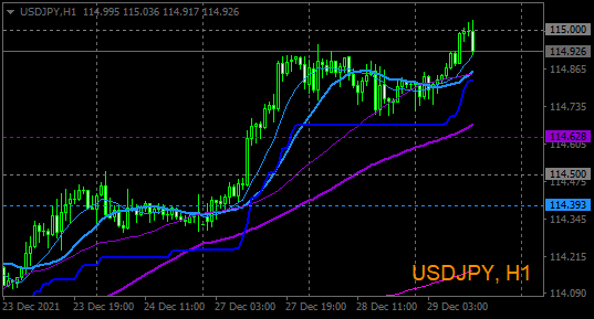 先ほどドル円は115円の大台にタッチしました。その後少し押されていますが、ドル高相場を象徴する値動きとなっています。上のチャートをご覧いだだくと、先週は114.393(青点線)の節目でレンジを形成した後、月曜日には上方へブレイク、114.50を越えて一気に上昇、更に114.628(紫点線)を越えると115円をロックオンしました。そして昨日の調整を経て、今日の欧州時間から一気に115円タッチとなりました。