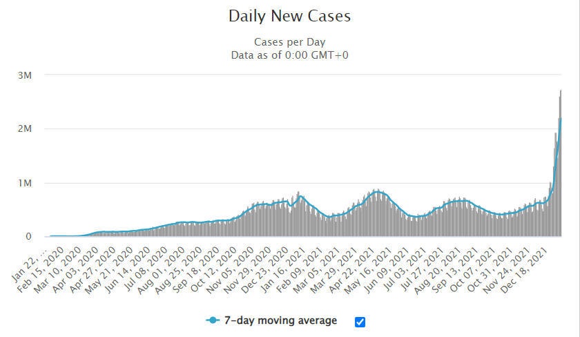 - コロナ新規感染者数の推移(7日移動平均)は引き続き急増している(添付チャートDaily New Cases )