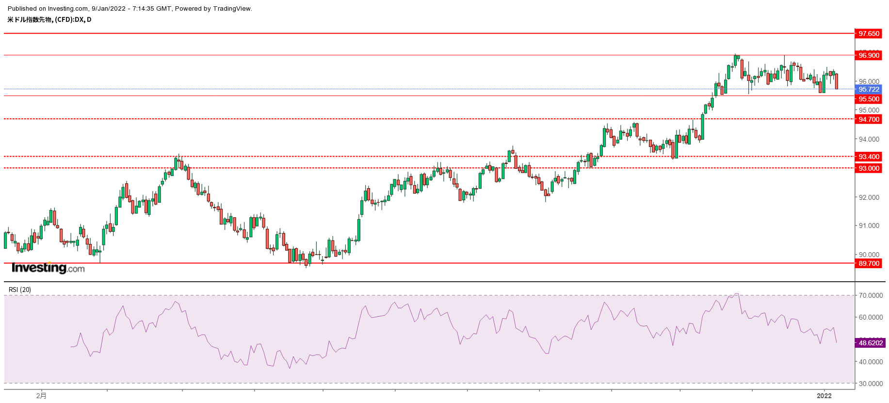 - 引き続きドル高基調の中で95.50~96.90レンジで推移している