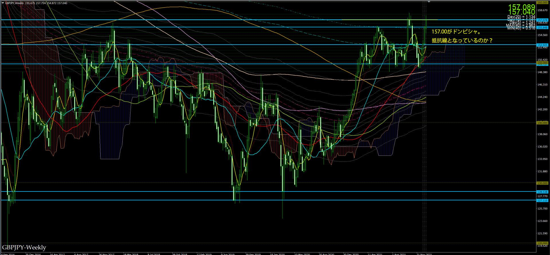 週足をみると、157.00あたりでドンピシャ発生。157.000が上値抵抗線となっているのか?