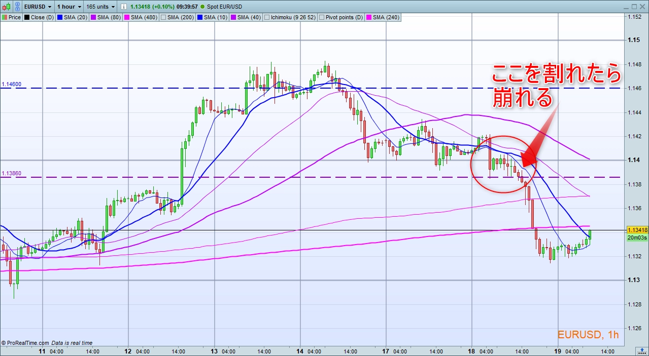 ポンドドルの下落を横目に頑張っていたユーロドルでしたが、やがて一気に下落。我慢していた分、大きく下げる展開となりました。