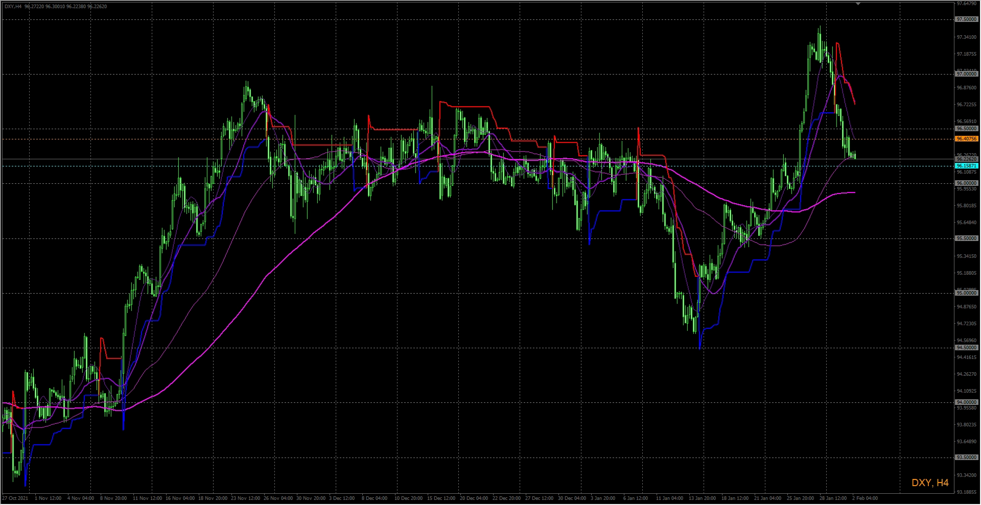 この線は私の分析によって引いたものなのですが、ローソク足がオレンジ色の線の上にいる間は、ドルの強気が続く傾向が強く、逆に、水色の線よりも下にいる間は、ドルの弱気が続く傾向があるというものです。