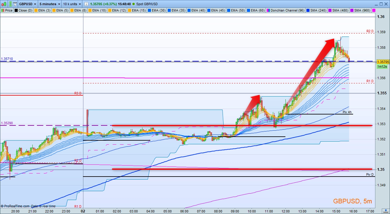 もう一つ、ポンドドルは「1.35を下回らずに1.35295(紫点線)を上抜けすれば追っかけまたは押し目買い」というトレード計画を書きました。こちらも、計画通りの値動きで推移し、大きな利幅となっています。