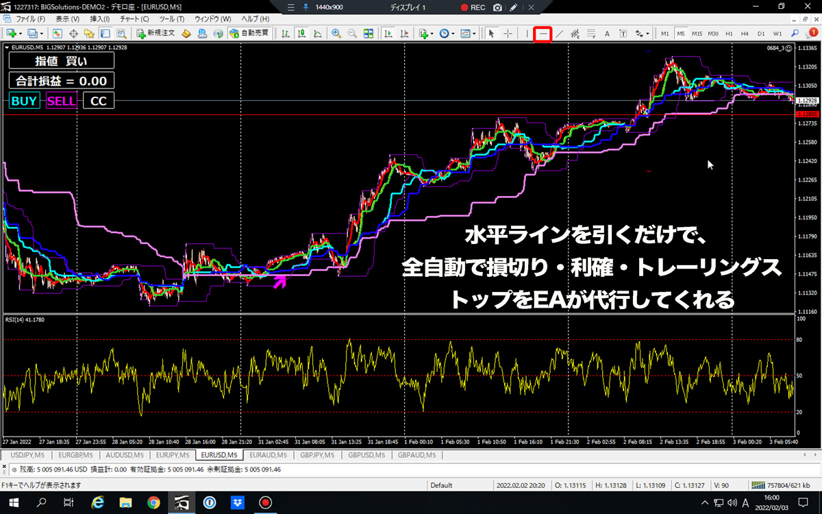 またライントレードで、MT4にデフォルトの水平ラインをクリックするだけで、ラインタッチで自動エントリーし損切り・利確・トレーリングを同時に行える半自動タイプのライントレードを実現させています。