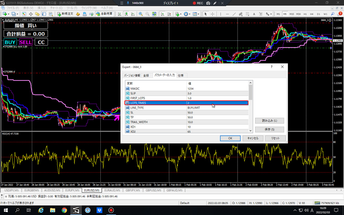 相場が思惑と反対に言って含み損が出ていた時に、再度成り行きでEAの『BUY』をクリックすると、自動的に倍の2ロットが成り行きエントリーされます。