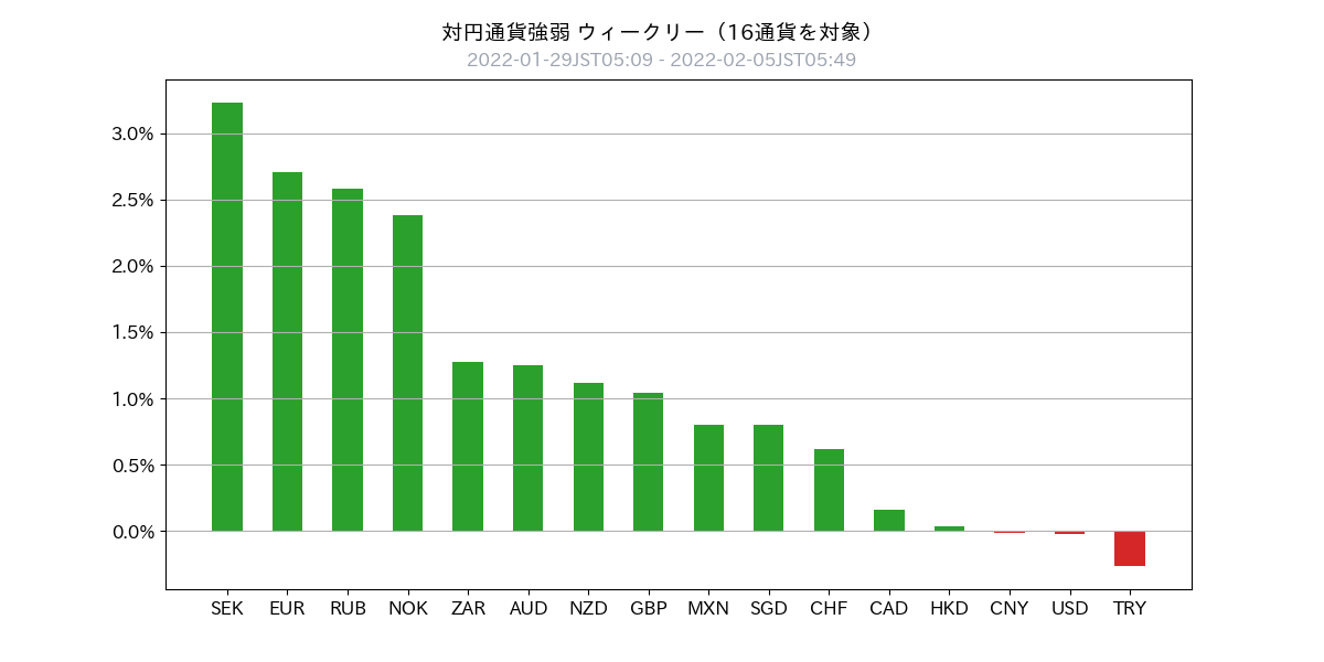 - まとめると先週の通貨強弱は右記の通り ユーロ > スカンジナビア通貨とロシアルーブル > 英ポンド > 円 > 米ドルと人民元