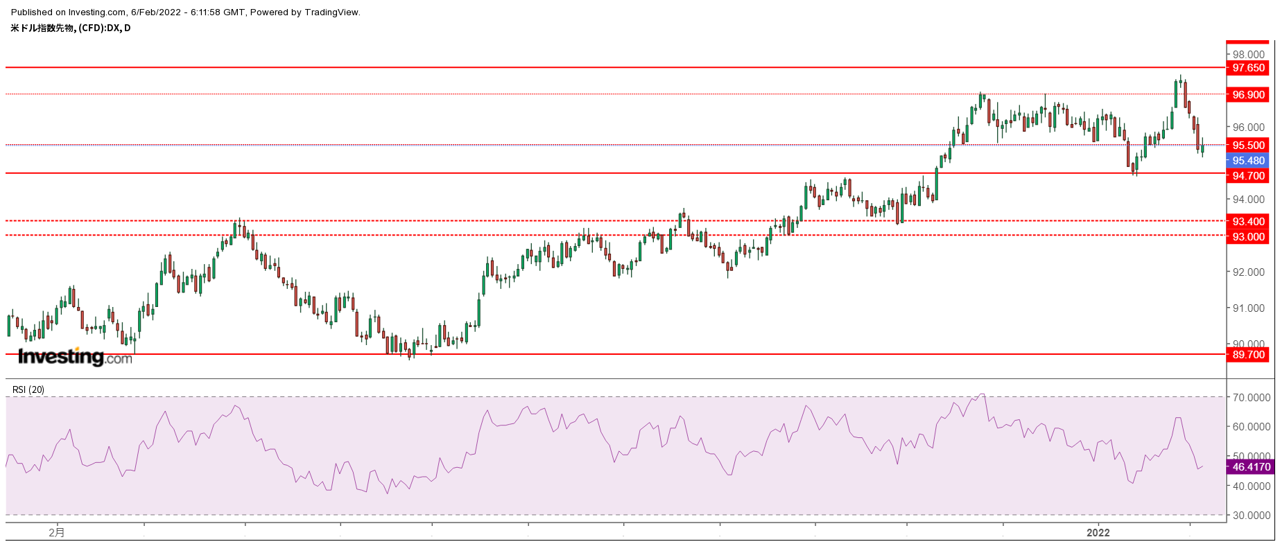 - ドルインデックス=ドルの総合的な強さを示す指標(バスケットの中身:EUR57.6%, JPY13.6%, GBP11.9%, CAD9.1%, SEK,4.2%, CHF3.6%)