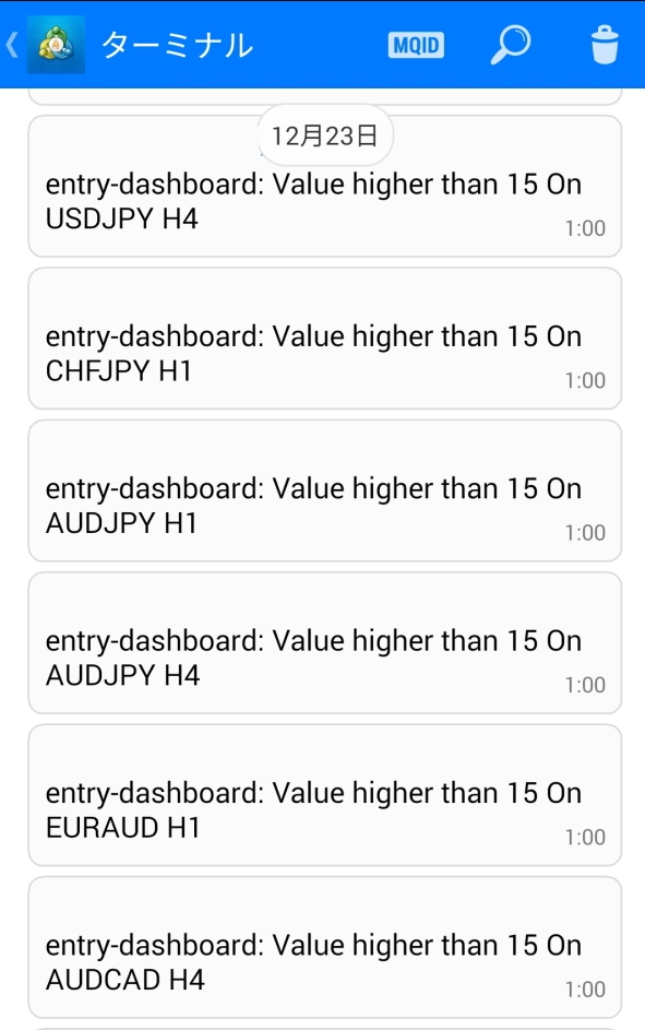 スマホへのサインの通知頻度は、平均で1日20回から30回以上あります。MT4アプリに通知が下記の様に届きます。通知が届きましたら、すぐにエントリーをしましょう。 証拠金のプラス1%、3%など、もしくはプラス20pipsから100pipなどで利確をしていきましたら、どんどん利益を上げていけます。