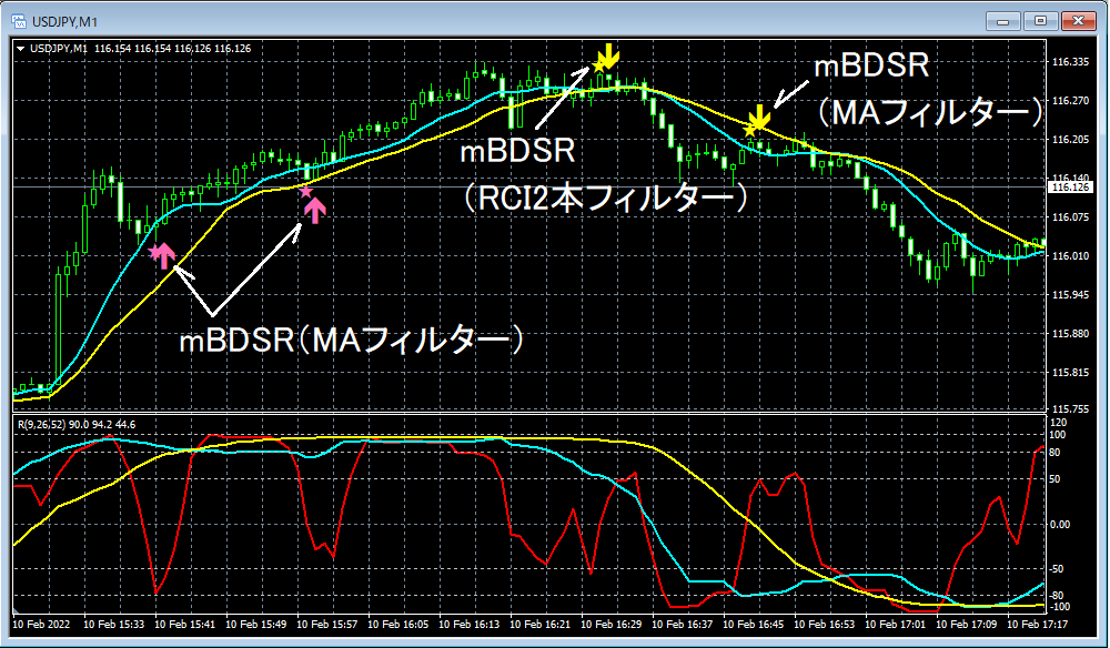 下記では、2月10日の米CPI発表後のドル円 1分足のmBDSRのサインを紹介します。