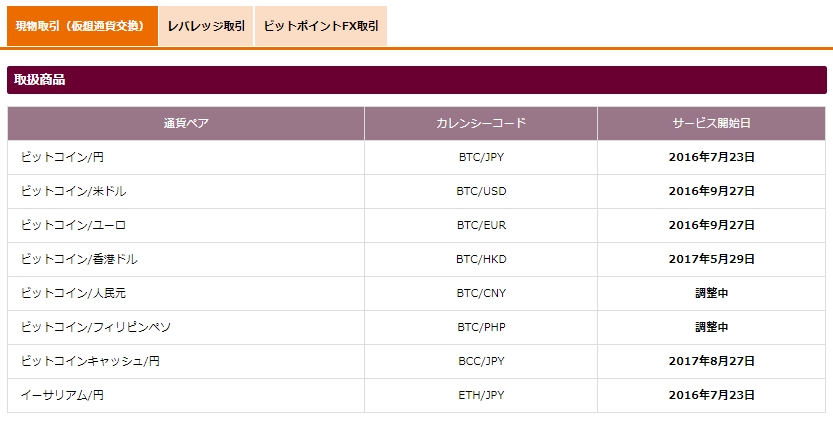 ビットコインの他には、ビットコインキャッシュ/円、イーサリアム/円があります。