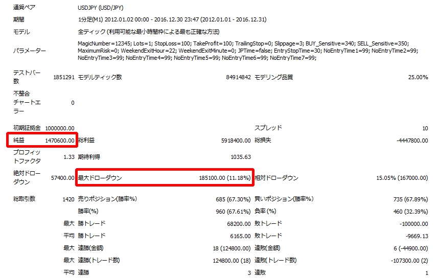 公式バックテストでは、1.0(10万通貨固定)で、スプレッド5(0.5pips)、