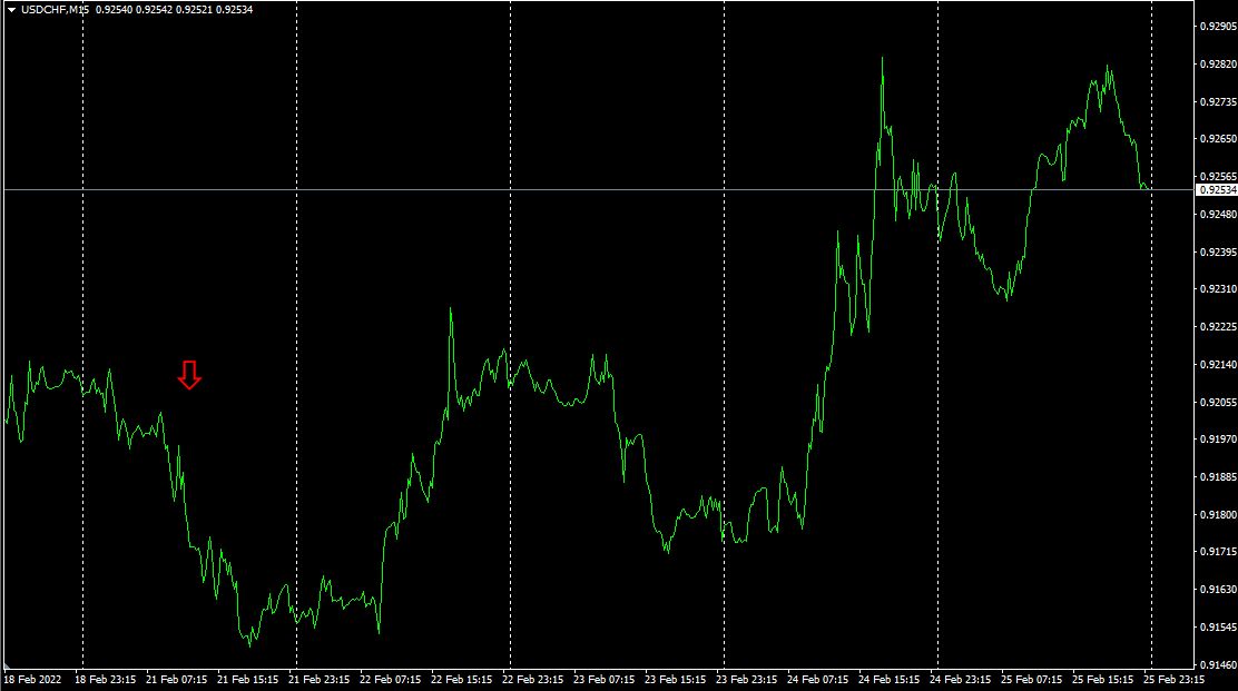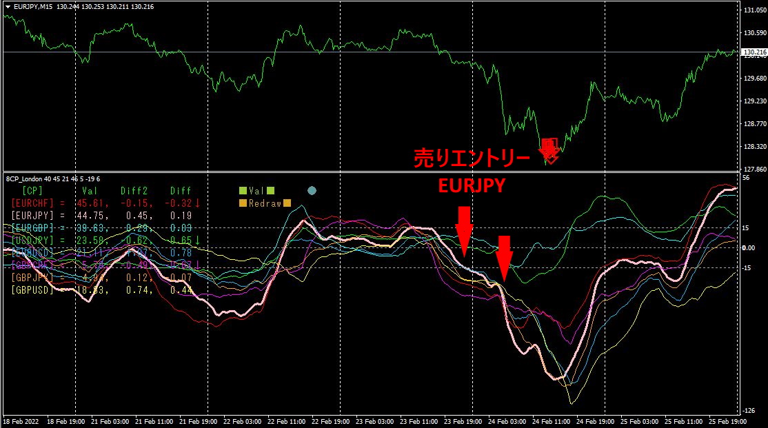 「8CP見える化インジケータ」の売りエントリーポイントは、2月23日に出現しています。ここから売れば約190PIPSの利益が得られました。「28通貨ペア一覧インジケータ」ではアラートの出る位置が遅すぎました。