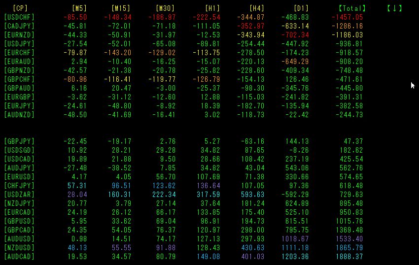 Total数値で並び替えています。USDCHFのマイナス数値が大きく、[M5][M15][M30[H1]のカラーが全て赤色表示になっています。今、ダウントレンドが発生しているUSDCHFを、売りでトレードすれば良いことが一瞬で判断できます。