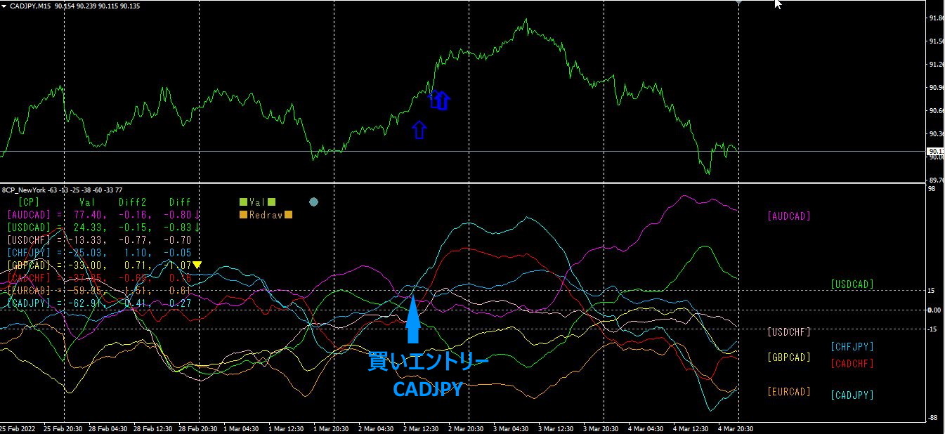 「28通貨ペア一覧インジケータ」、「8CP見える化インジケータ」のどちらも、3月2日に買いエントリーポイントが出現しています。ここから買えば約100PIPSの利益が得られました。