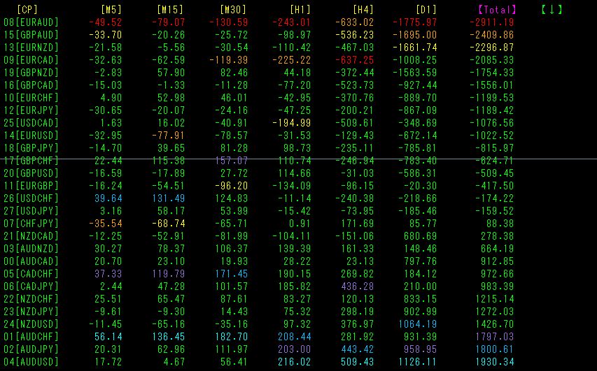 Total数値で並び替えています。EURAUDのマイナス数値が大きく、[M5][M15][M30[H1][D1][Total]のカラーが全て赤色表示になっています。今、ダウントレンドが発生しているEURAUDを選択し、売りでトレードすれば良いことが一瞬で判断できます。
