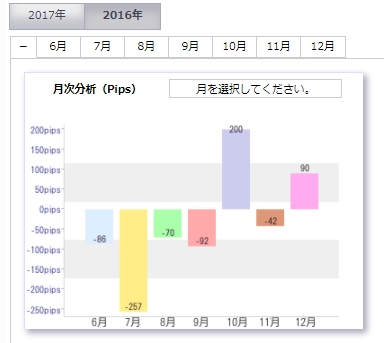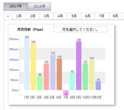2017年は7月以外全てプラスで、トータルで1600pips以上獲得となりました。