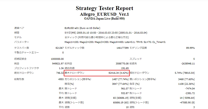 0.1ロット固定運用の場合の最大ドローダウンは82,416円でした。