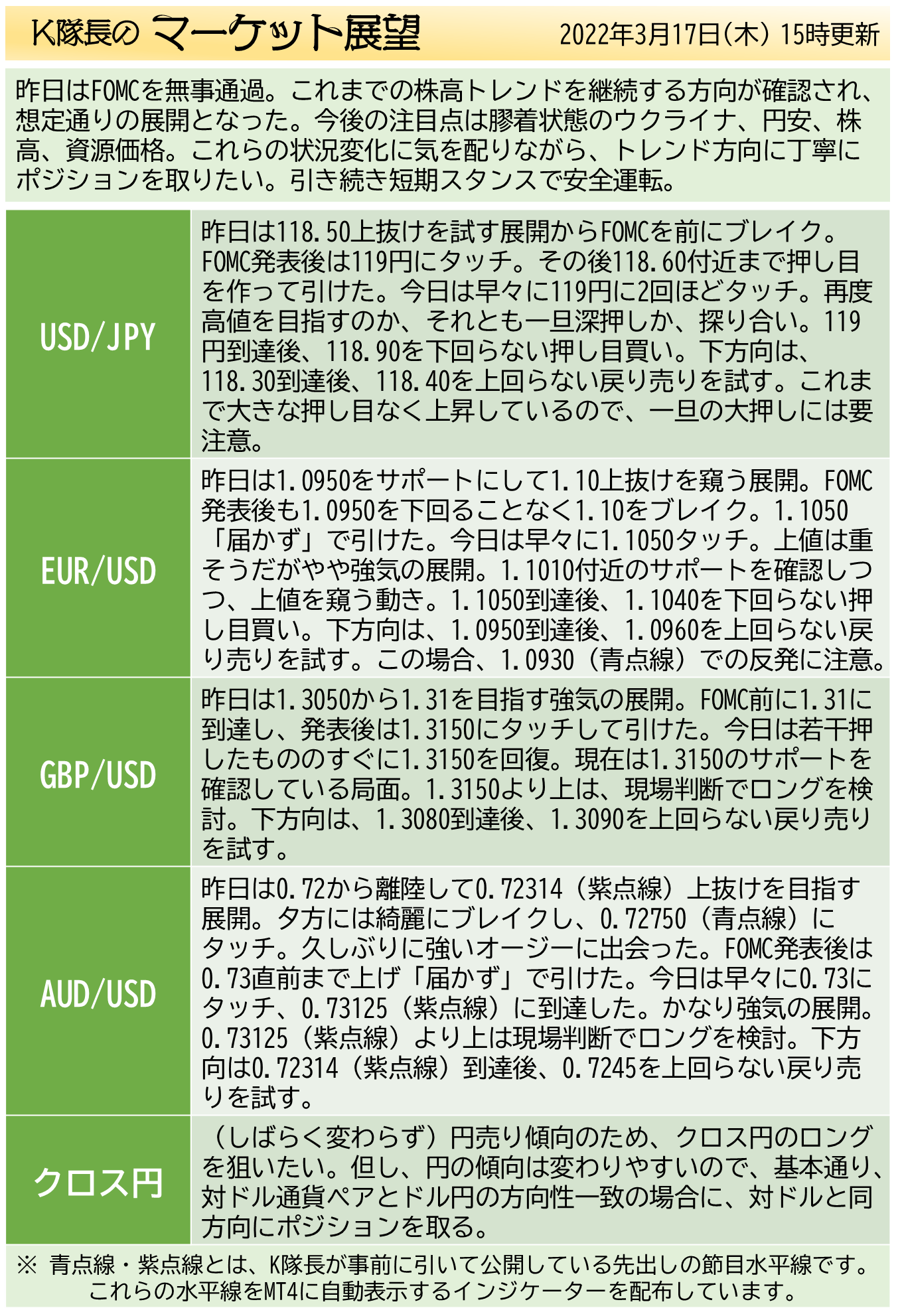 FOMCも無事通過、各所事前の予想通りの展開で波乱なく「こなした感じ」になりました。ウクライナ情勢や要人発言、特に円安に対する介入などに注意しながら、これからの新しい波に乗っていきたいところです。
