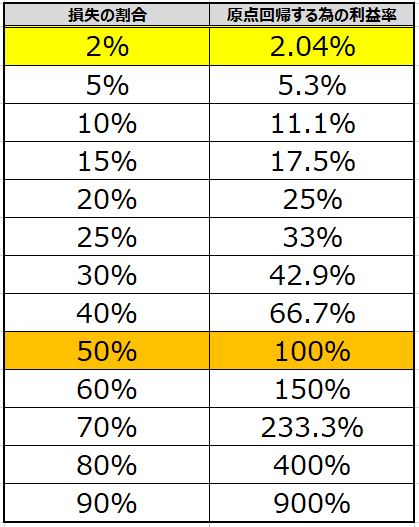 これは資産の何%の損失を出したら、取り返すのに何%の利益率が必要か?という一覧表になります。