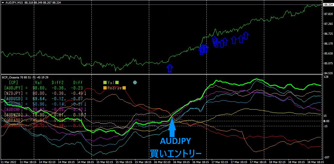 下半分は、「8CP見える化インジケータ」です。緑色太線のグラフが AUDJPYに相当します。