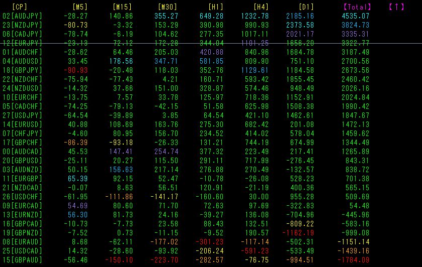 Total数値で並び替えています。AUDJPYのプラス数値が大きい上、[M30][H1][H4][D1][Total]のカラーが全て青色系表示になっています。今、大きな上昇トレンドが発生している通貨ペアがAUDJPYであり、短期的には押し目になっていることが読み取れます。そこで、AUDJPYを買いでトレードすれば良いことが判断できます。しかも、長期足の数値が大きいので、やや長期目線で保有し続ければ良いという情報も得られます。