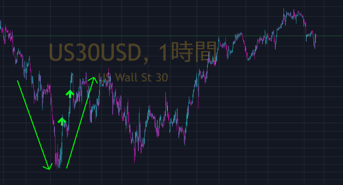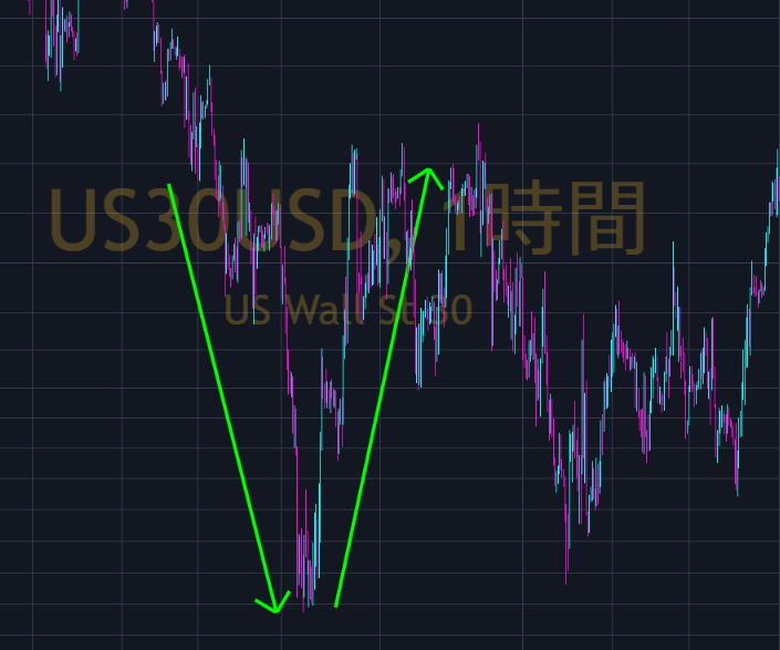 ※たまにアナリストの方が「下落 → 横横 → 上昇」のような台形になるという解説をされていますが、大きく見ればそう見えなくない場面もありますがそれは間違えです。