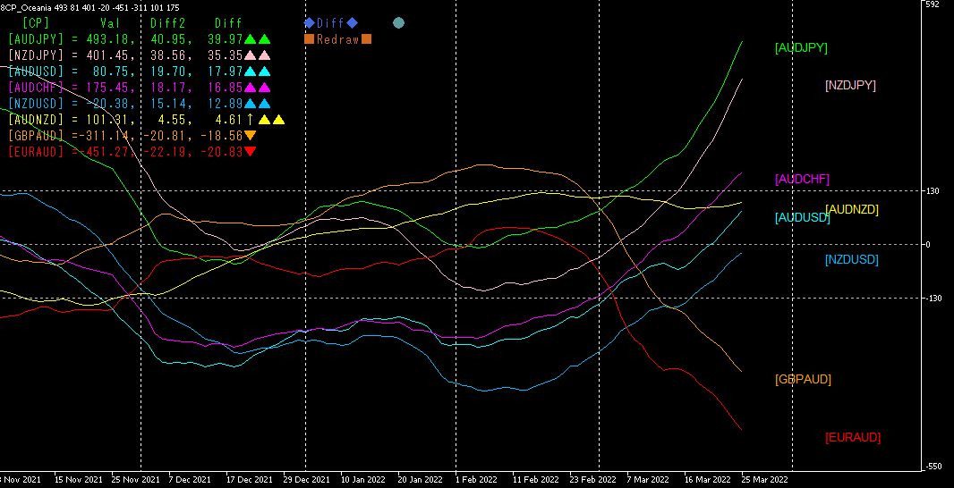 買いで突出しているのは、AUDJPYとNZDJPY、売りで突出しているは、EURAUDとGBPAUDになります。8本のチャート群から飛び出したポイントでそれぞれポジションを建てて、3月25日に決済したと仮定します。