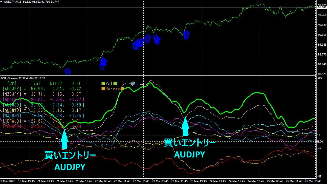 下半分は、「8CP見える化インジケータ」です。緑色太線のグラフが AUDJPYに相当します。