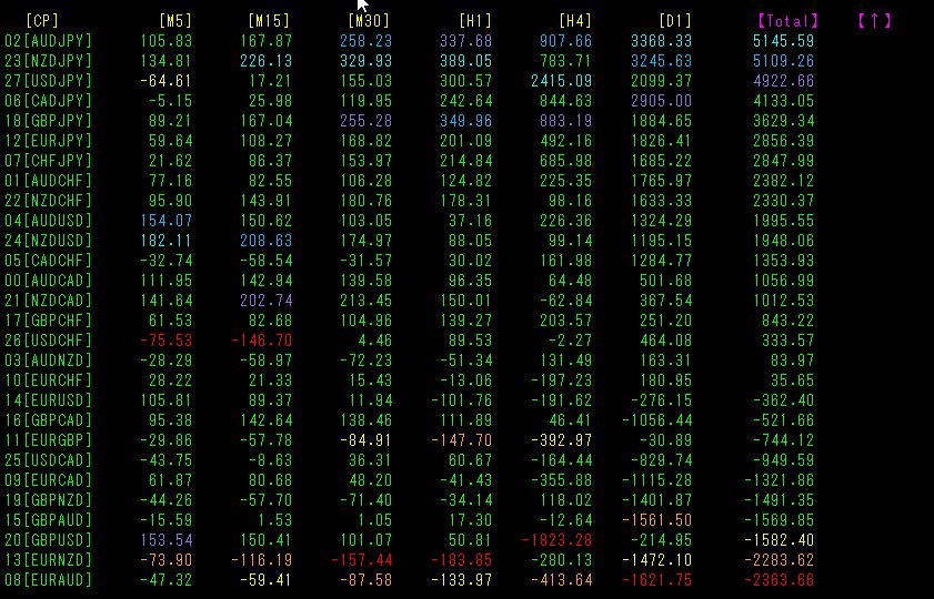 Total数値で並び替えています。AUDJPYのプラス数値が5145と大きい上、[M30][H1][H4][D1][Total]のカラーが全て青色系表示になっています。今、大きな上昇トレンドが発生している通貨ペアがAUDJPYであり、[M5]から[D1]までの全ての数値がプラスの上、長期足で最も数値が大きい通貨ペアがAUDJPYであることが、一目で読み取れます。従って、AUDJPYを買いでトレードすれば良いこと、さらに長期足の数値が特に優れているので、買いポジションを長期目線で保有し続ければ、大きな利益が得られることが期待できます。