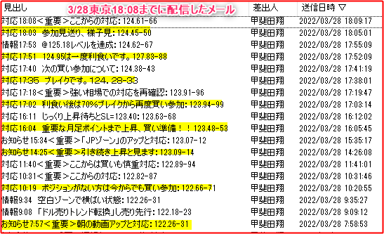 昨日アップし忘れました、3/28東京で18:08までに配信した情報メールの一覧です。 午前中は、朝の対応通りで簡単な投資でしたので、5通しかありません。相場が動くと、一気にリアルタイムの配信が増えます。