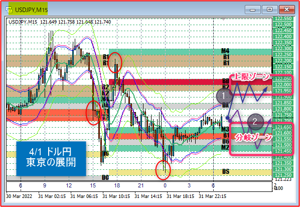 ”分岐ゾーン”121.70=122.25の上抜け先行するも、高値122.45と期待の上伸とはならず15時頃から急落。