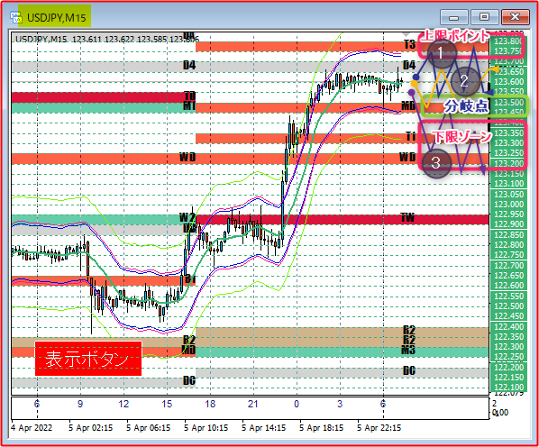 1)"上限ポイント"とした天井ポイント123.75-80の上値トライが続くも壁のまま終了
