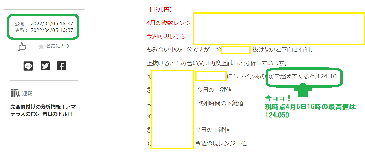 ①も上抜け、記事通り、次の分析値124.10付近(124.050)で一旦弾いています。