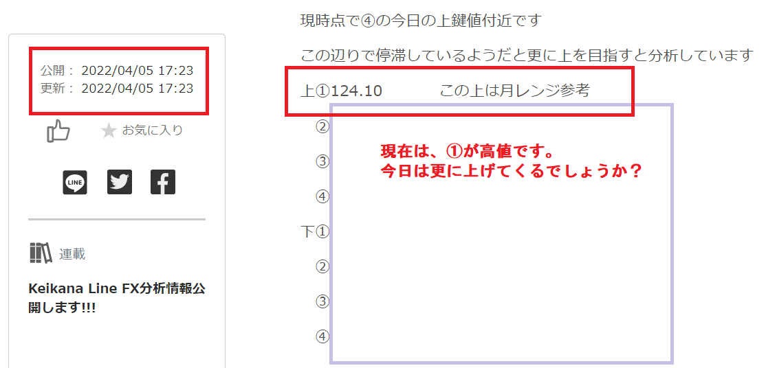 現在の高値は、昨日記事の①付近の124.050です。