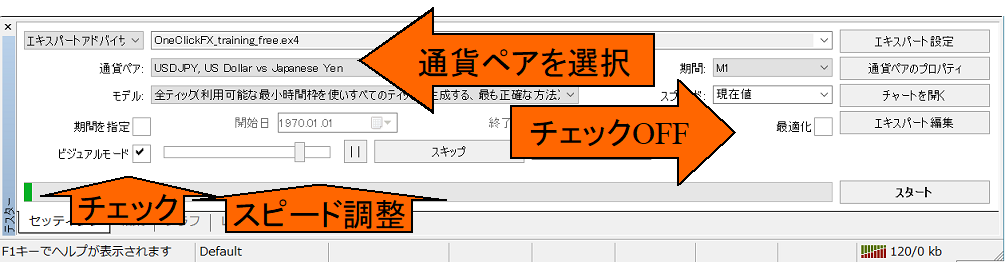 5) ストラテジーテスターから、Expert「OneClickFX_training_free」、任意の通貨ペア、モデルは全ティックを選びます。ビジュアルモードのチェックを入れ、最適化のチェックを外します。
