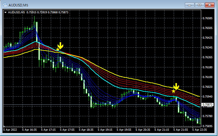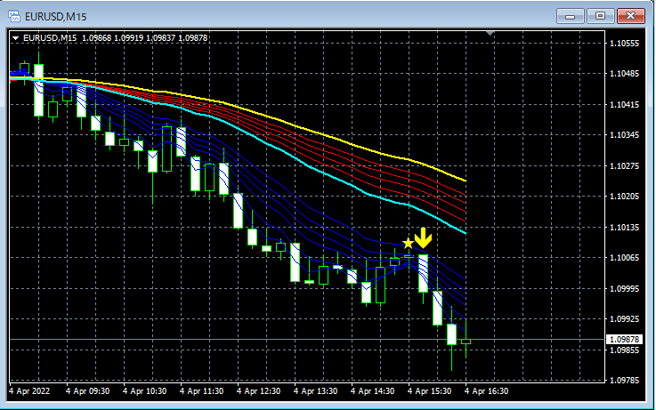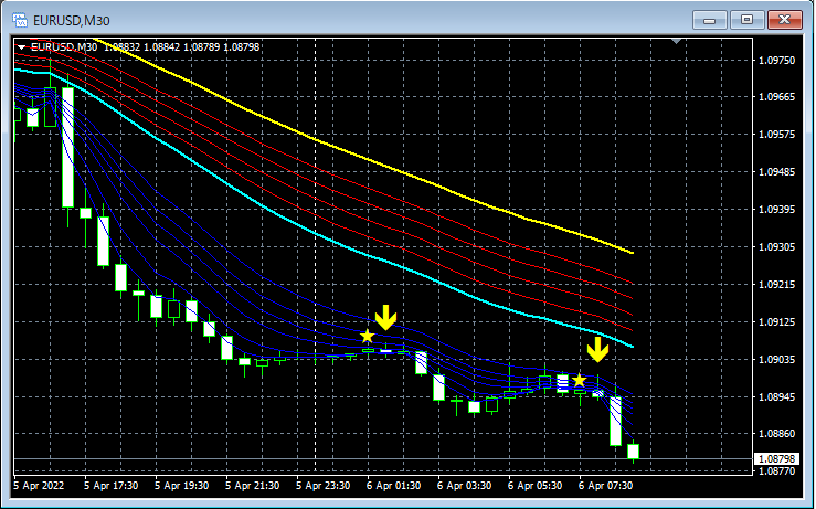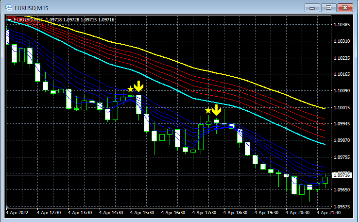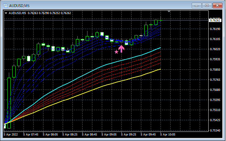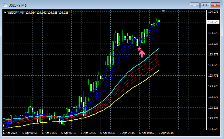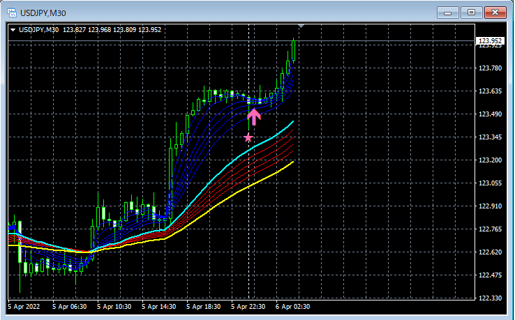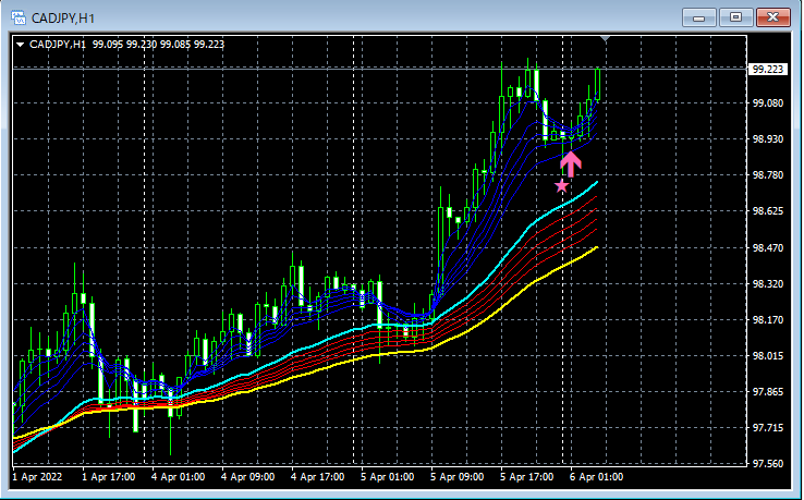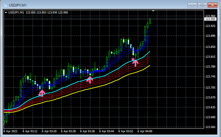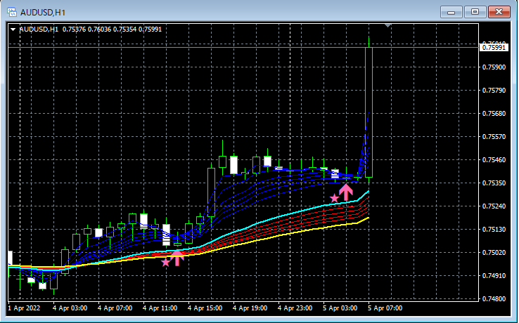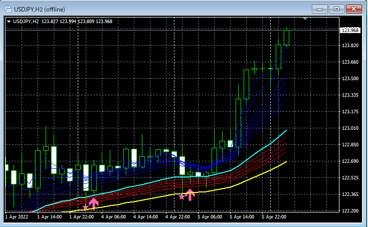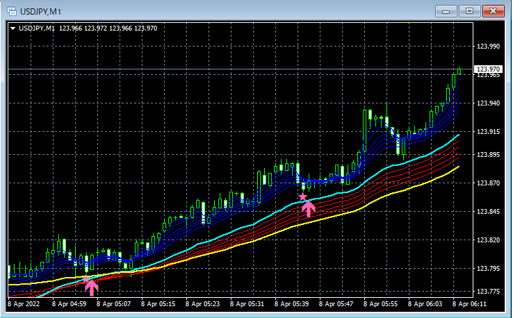 RCI, MA, GMMAなどとの組み合わせで威力を発揮するインジケーター 4月4日~4月8日に見られたサインの例