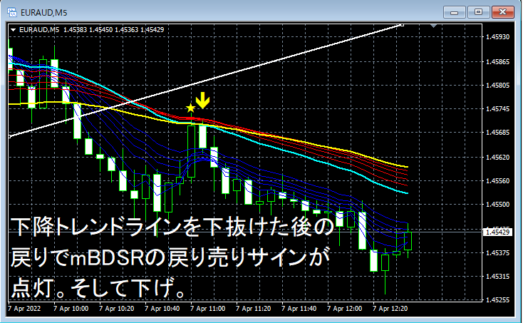 下記では、4月4日~4月8日において、 mBDSR(移動平均線フィルターバージョン)のサイン が上手く機能したと思われる例のうちの一部をピックアップして紹介します。