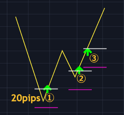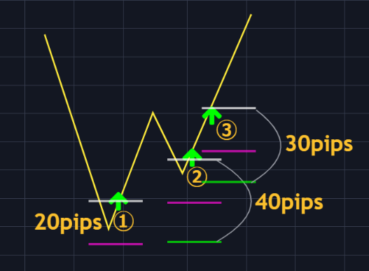 例えば先程の①-③のEntry。これを全て10万通貨で行った場合、損切が20pipsであるのなら損切金額としては2万円となります。