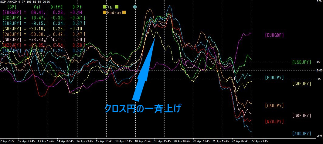 下半分は、「8CP見える化インジケータ」です。水色太線のグラフが CADJPYに相当します。