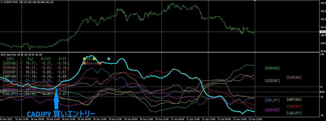 月曜日に「8CP見える化インジケータ」のエントリーポイントでCADJPYを買えば、200PIPS以上の利益が得られました。