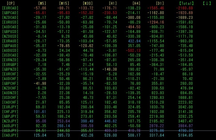 [Total]で昇順に並び替えています。一番下の行のCADJPYの数値を見てください。なんと、[M5][M15][M30][H1][H4][D1][Total]の全ての時間軸で水色表示になっています! しかも、[Total]の数値で5194.85のプラス表示となっています。全時間軸で強い上昇トレンドが発生しているわけですから、これはもう「買い」しかありません。