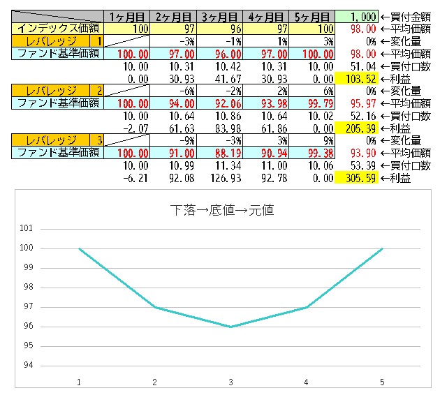 買付後、上昇することなく下落し、底値をつけて元値に戻った場合にどうなるのかのシミュレーションです。