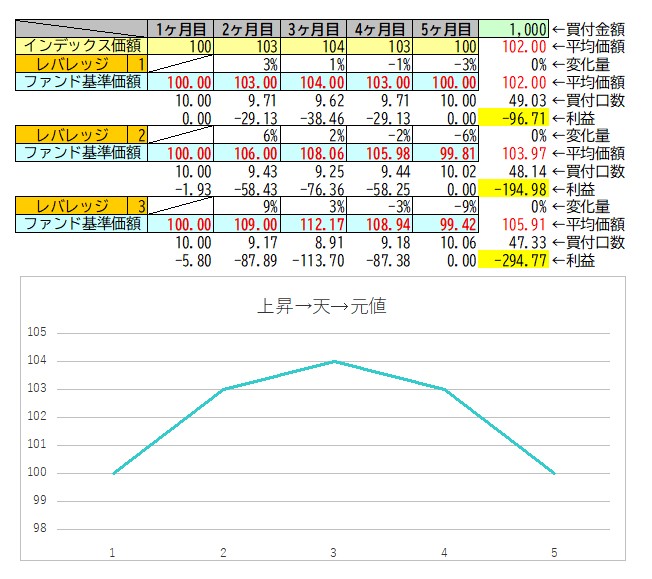 買付後、上昇し、天井をつけた後、元値に戻った場合にどうなるのかのシミュレーションです。